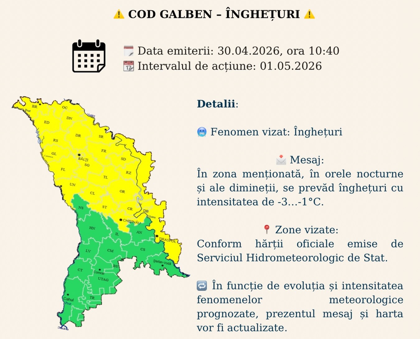 Serviciul Hidrometeorologic de Stat menționează că avertizarea va fi actualizată în funcție de evoluția fenomenelor meteorologice și recomandă monitorizarea permanentă a prognozelor, în special de către fermieri.