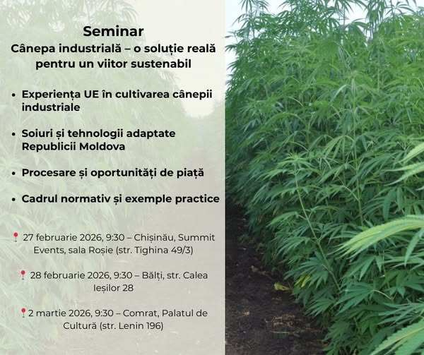Agenda include prezentări despre experiența statelor membre ale Uniunii Europene, inclusiv a Cehiei, în producerea cânepei în scopuri industriale, soiurile recomandate pentru Republica Moldova, tehnologiile de cultivare și recoltare, procesarea post-recoltare și oportunitățile de comercializare. De asemenea, vor fi abordate aspecte privind valorificarea potențialului bioeconomic al cânepei industriale.