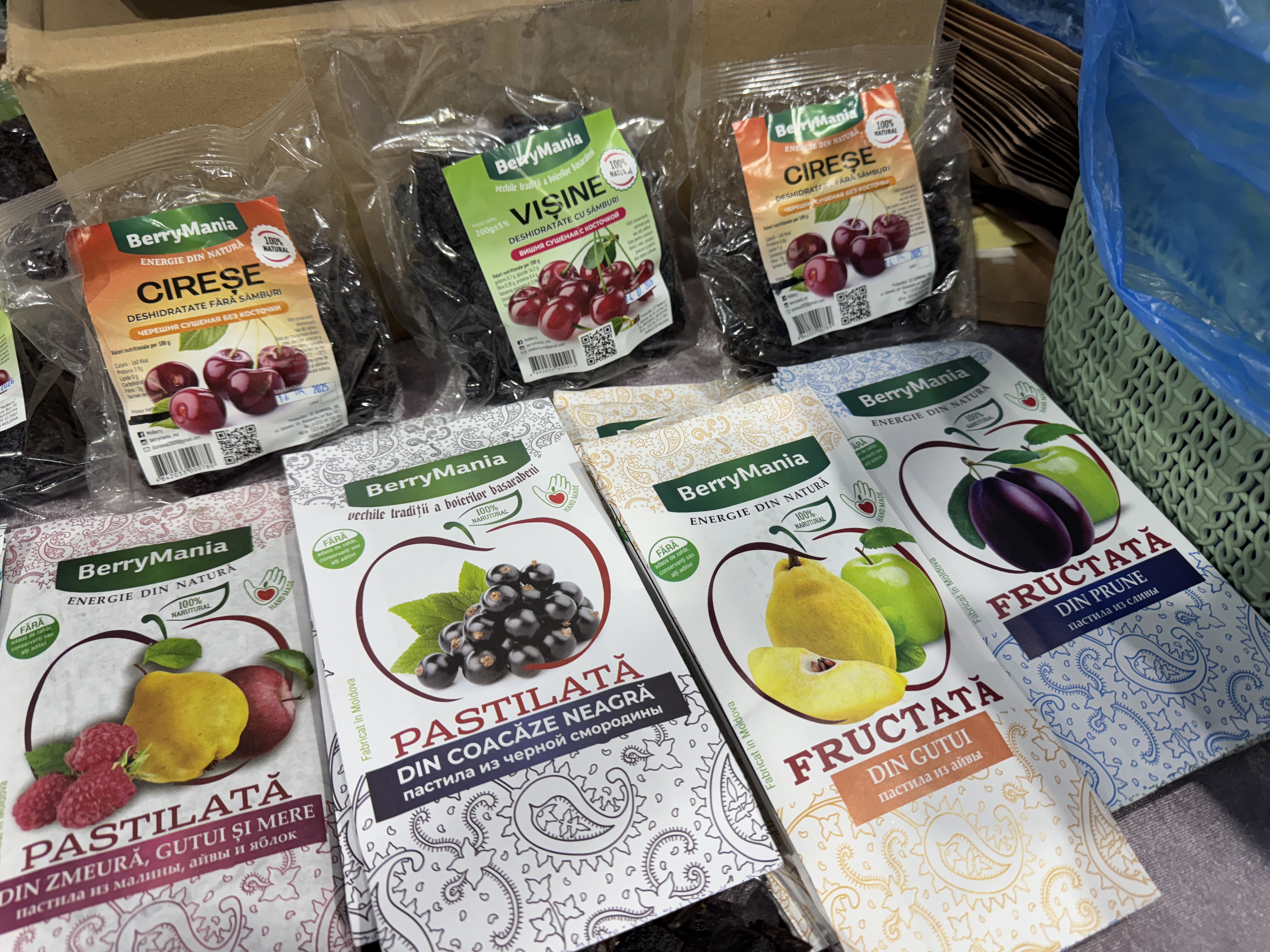 Un alt stand care atrage atenția este cel al companiei BerryMania din raionul Ialoveni, specializată în deshidratarea fructelor și legumelor. Inițiată în 2017-2018, afacerea a evoluat de la clasicele mere și pere, către produse mai sofisticate: roșii și dovlecei deshidratați, vișine fără sâmburi, dar și aronia – un superfruct cultivat pe propria plantație, fără tratamente chimice.